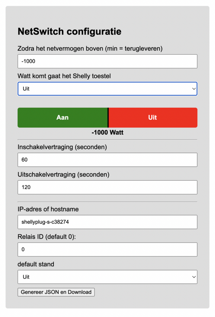 Door er schakelvertragingen aan toe te voegen zal de dongle pas reageren indien er langer dan 60 seconde 1.000Watt of meer wordt teruggeleverd. Andersom ook, zodra er langer dan 120 seconde minder dan 1000 Watt teruggeleverd wordt gaat de Shelly weer uit. Dit voorkomt veel aan/uit schakelen.