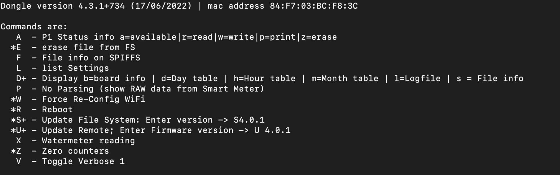 Een * voor een commando geeft aan dat dit alleen een hoofdletter dient te zijn. W <return> = force wifi reset.