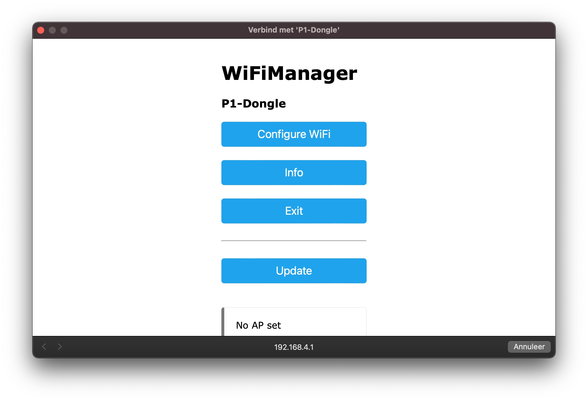Indien de wifi koppeling al eerder is gemaakt dan zal de dongle automatisch verbinden. Te zien aan de blauwe led op de dongle.